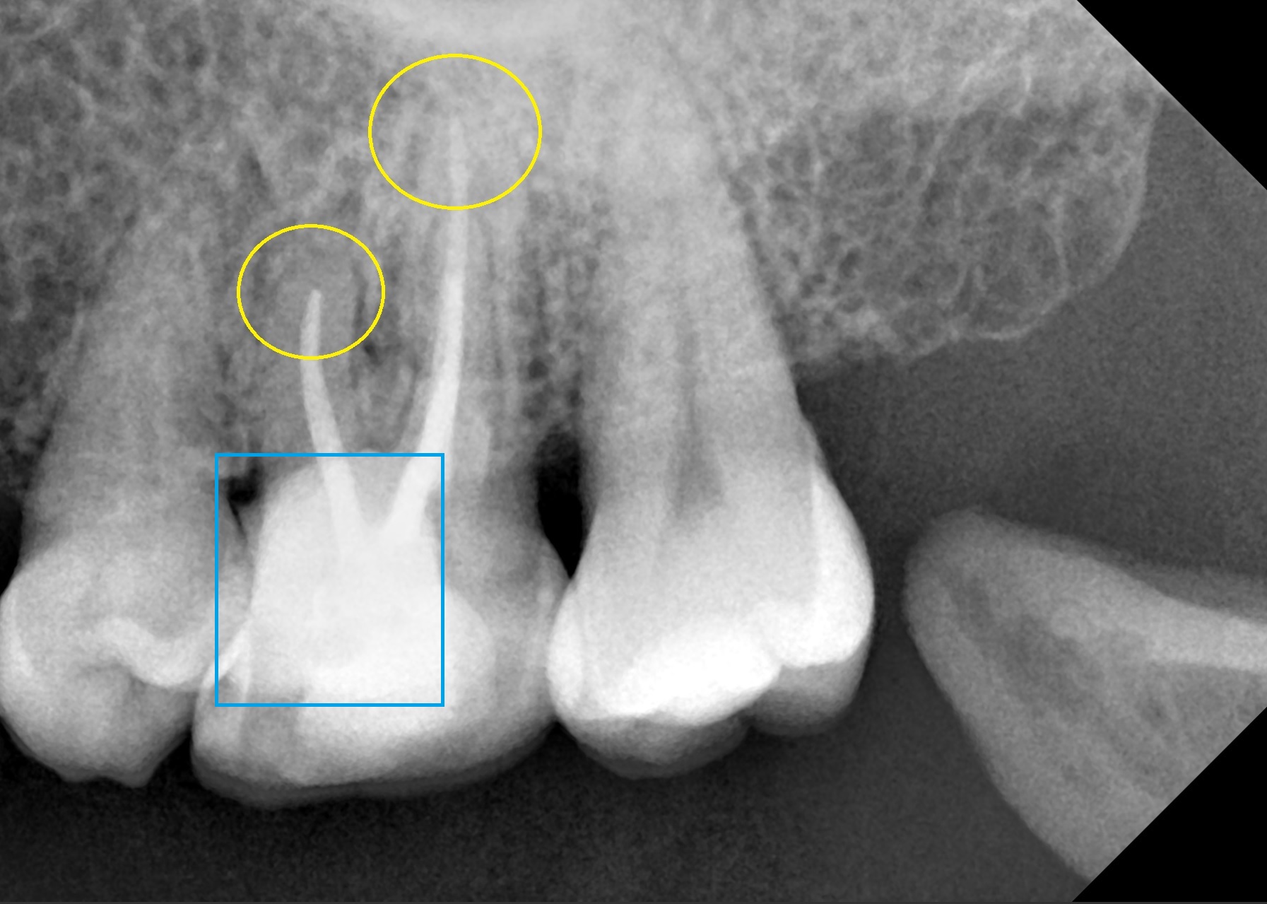 환자분께선 3번의 내원을 통해 신경치료를 마무리하였으며, 노란색 원형 부위를 보면 이전 포스팅에서 말씀드린바, (바로가기) 모든 근관 끝까지 신경 치료용 재료인 Gutta-percha 와 MTA가 잘 채워진 것을 확인하였습니다.